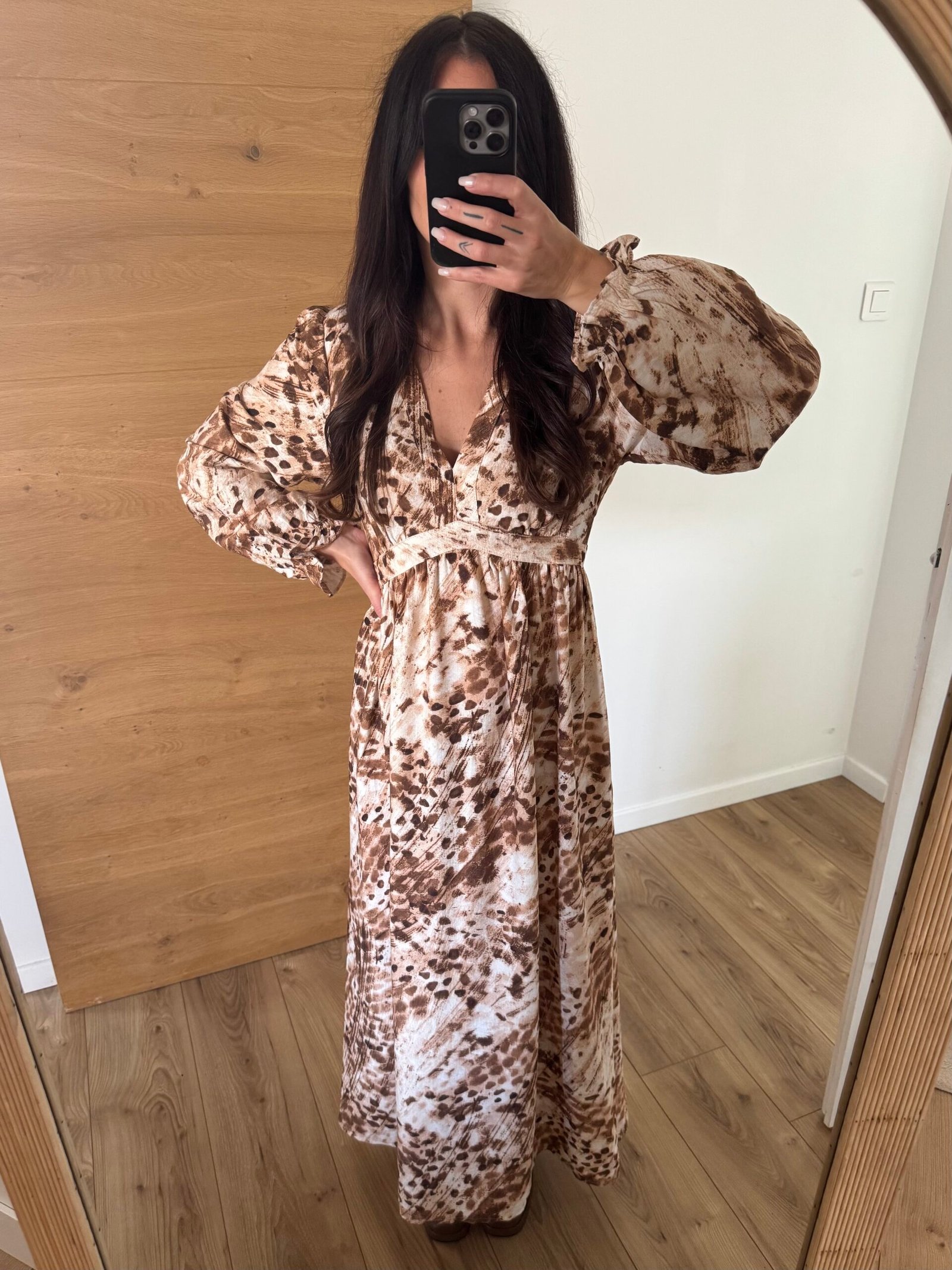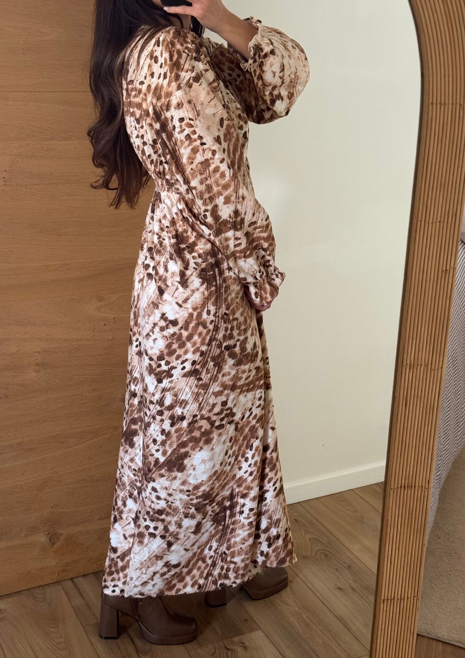 Sublime et fluide, la robe longue imprimée AMBRE joue avec des nuances de brun et de beige pour une allure élégante et affirmée.
