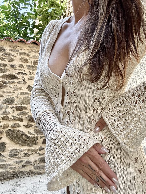 Le cardigan long JOSEPHA aux tons naturels, mêlant maille et crochet, offre un charme artisanal et authentique.